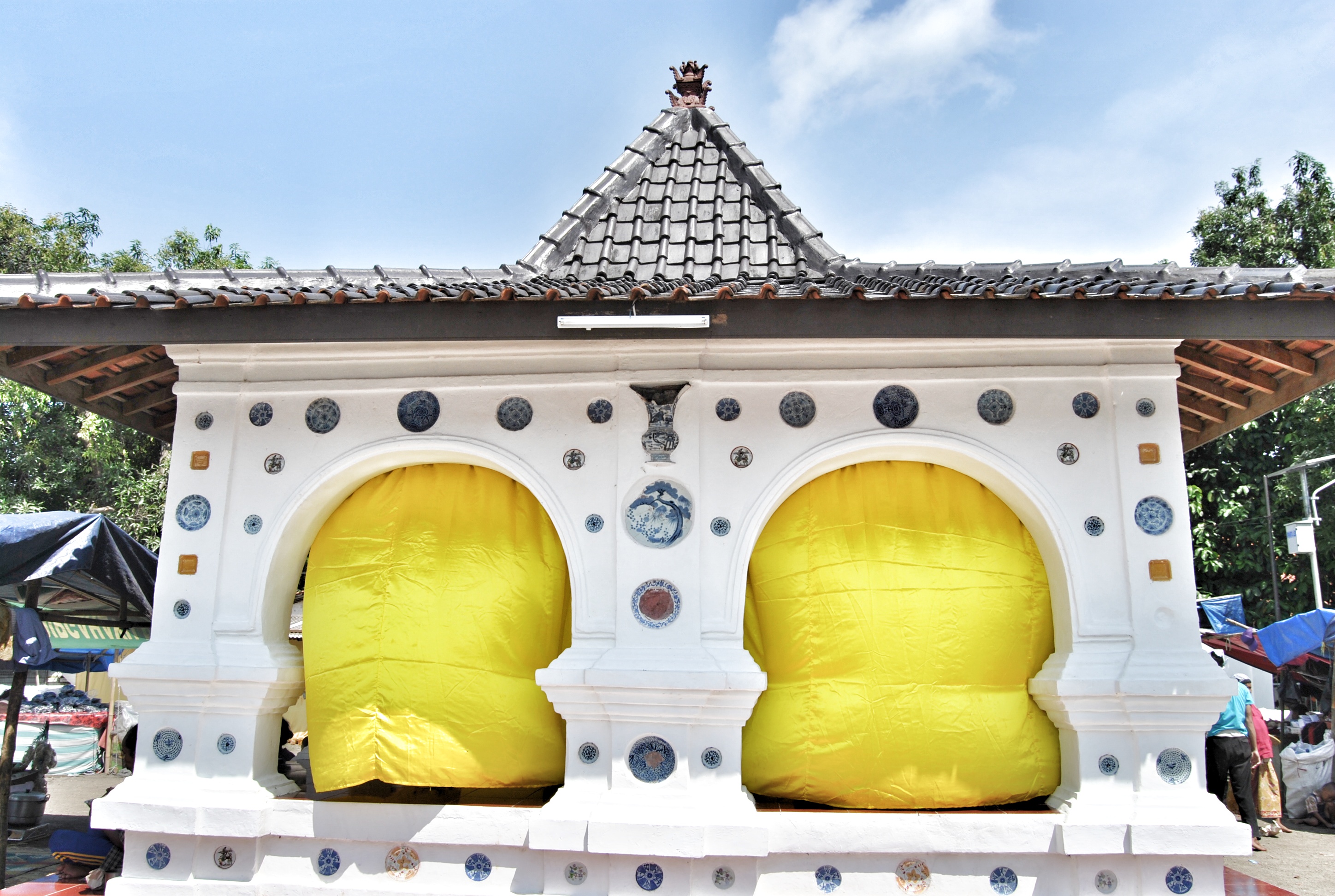Sedikit agak susah untuk menemukan Keraton Kanoman yang letaknya berada persis dibelakang pasar Kanoman. Kita harus masuk ke dalam gang dulu untuk bisa menemukan keraton ini. Berbeda dengan Keraton Kasepuhan yang didominasi bata merah, Keraton Kanoman justru didominasi warna putih dengan tempelan piring-piring kecil.
